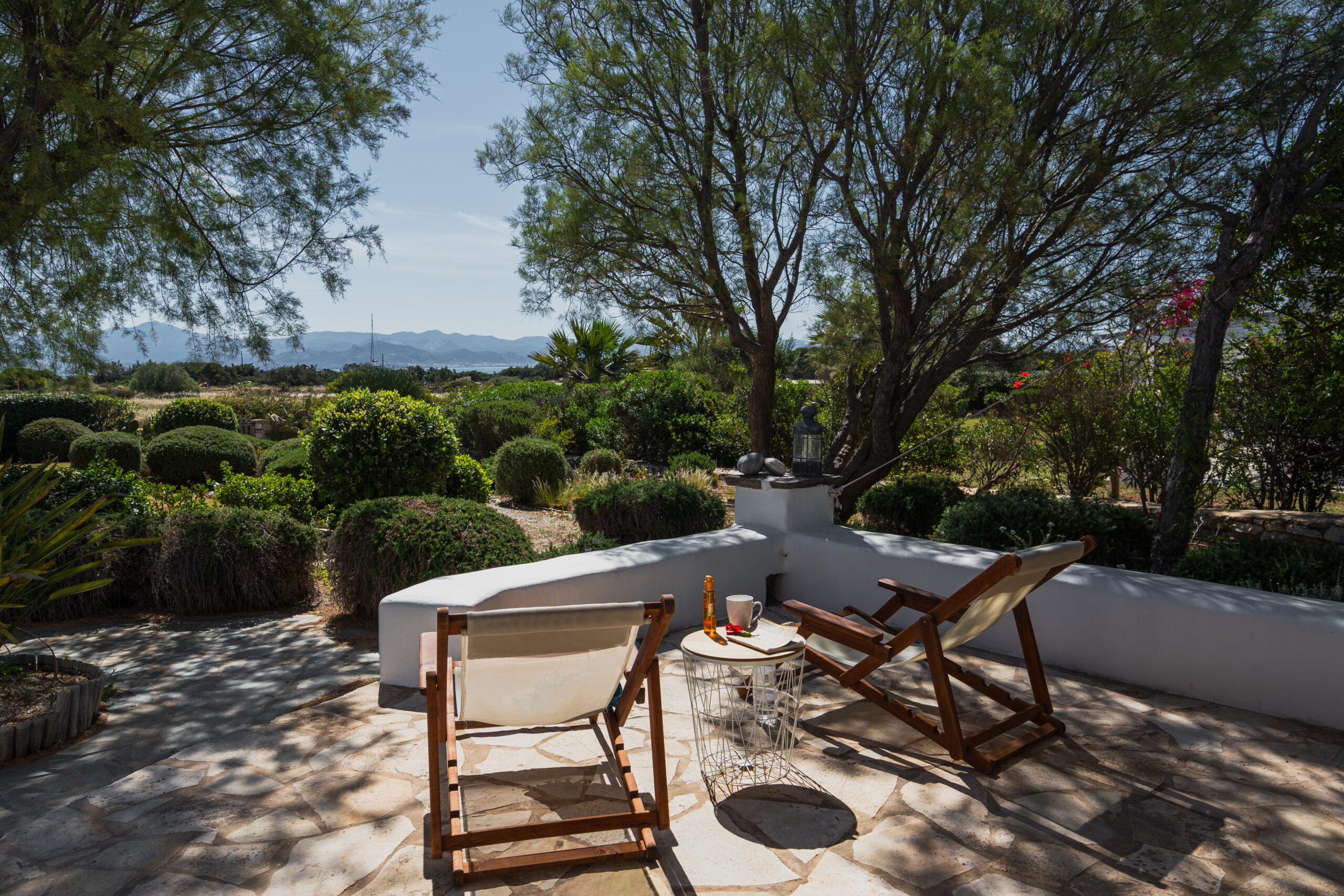 Situated in the Santa Maria area on the north-eastern tip of Paros, the villa occupies one of the island’s most naturally beautiful positions. Just picture the open Aegean stretching ahead and the island of Naxos visible on the horizon. It’s the kind of view that makes you stop mid-sentence.