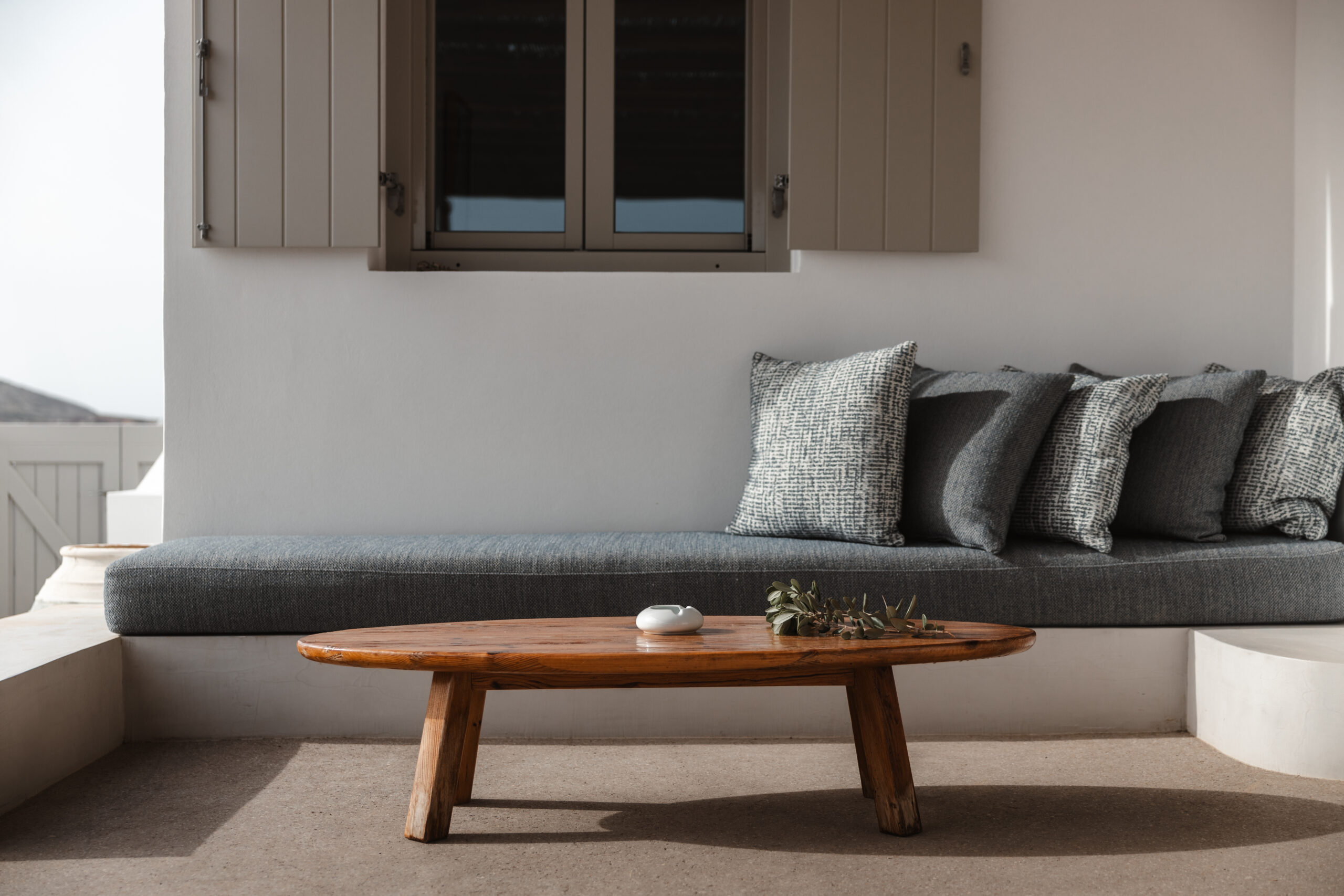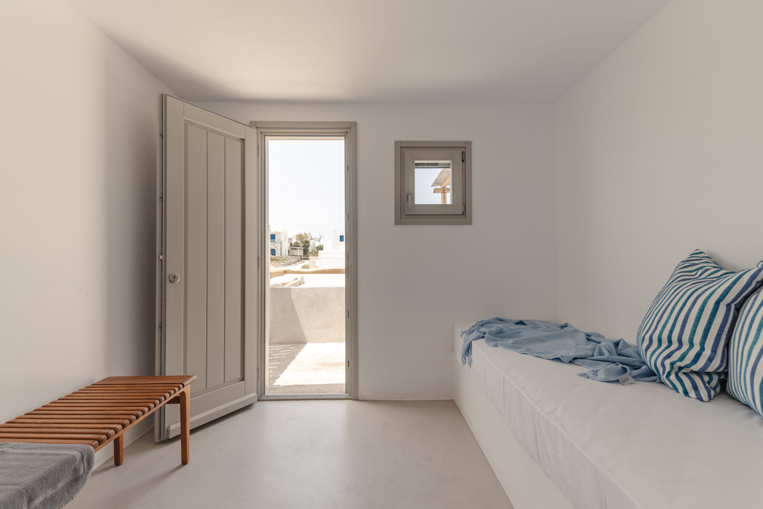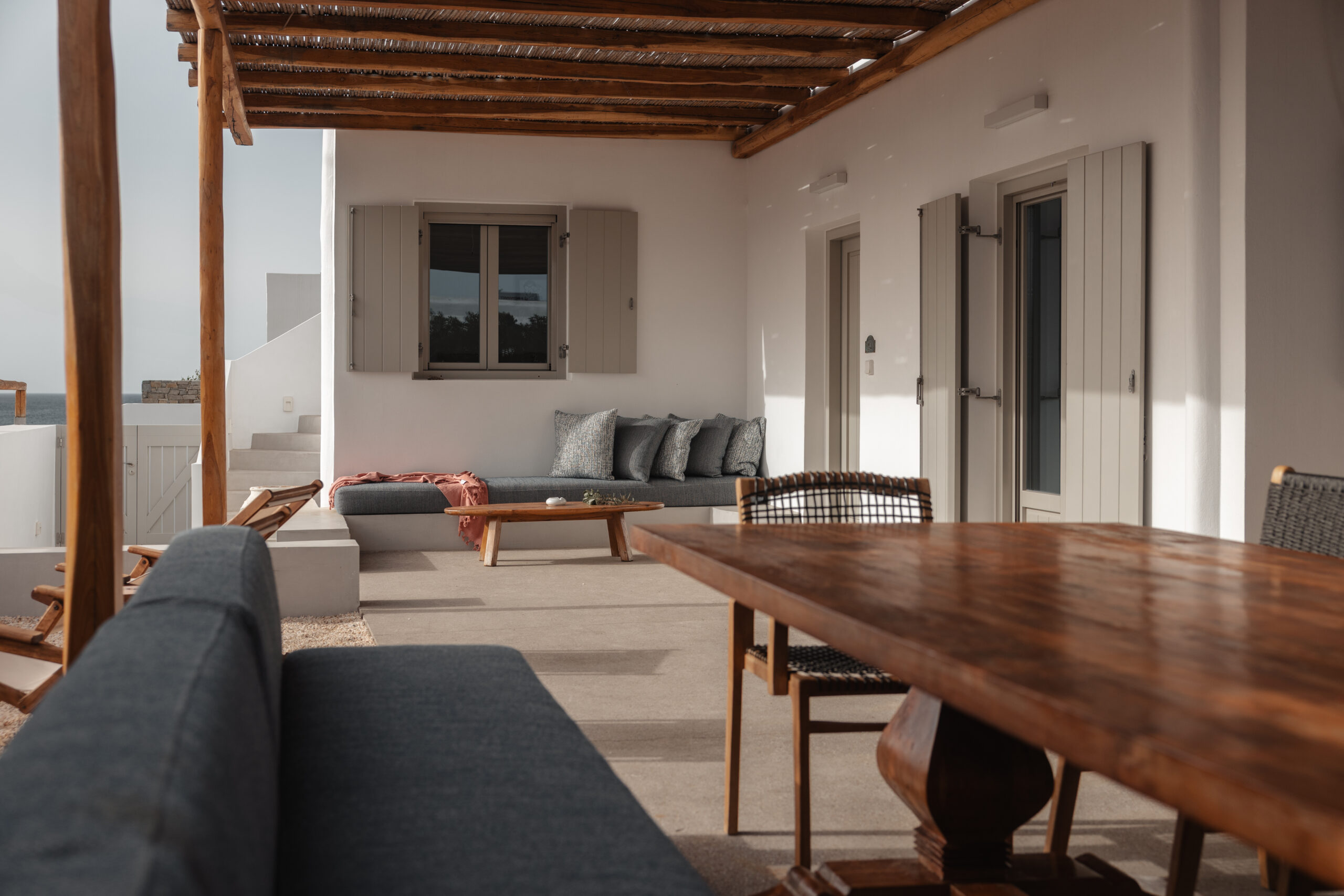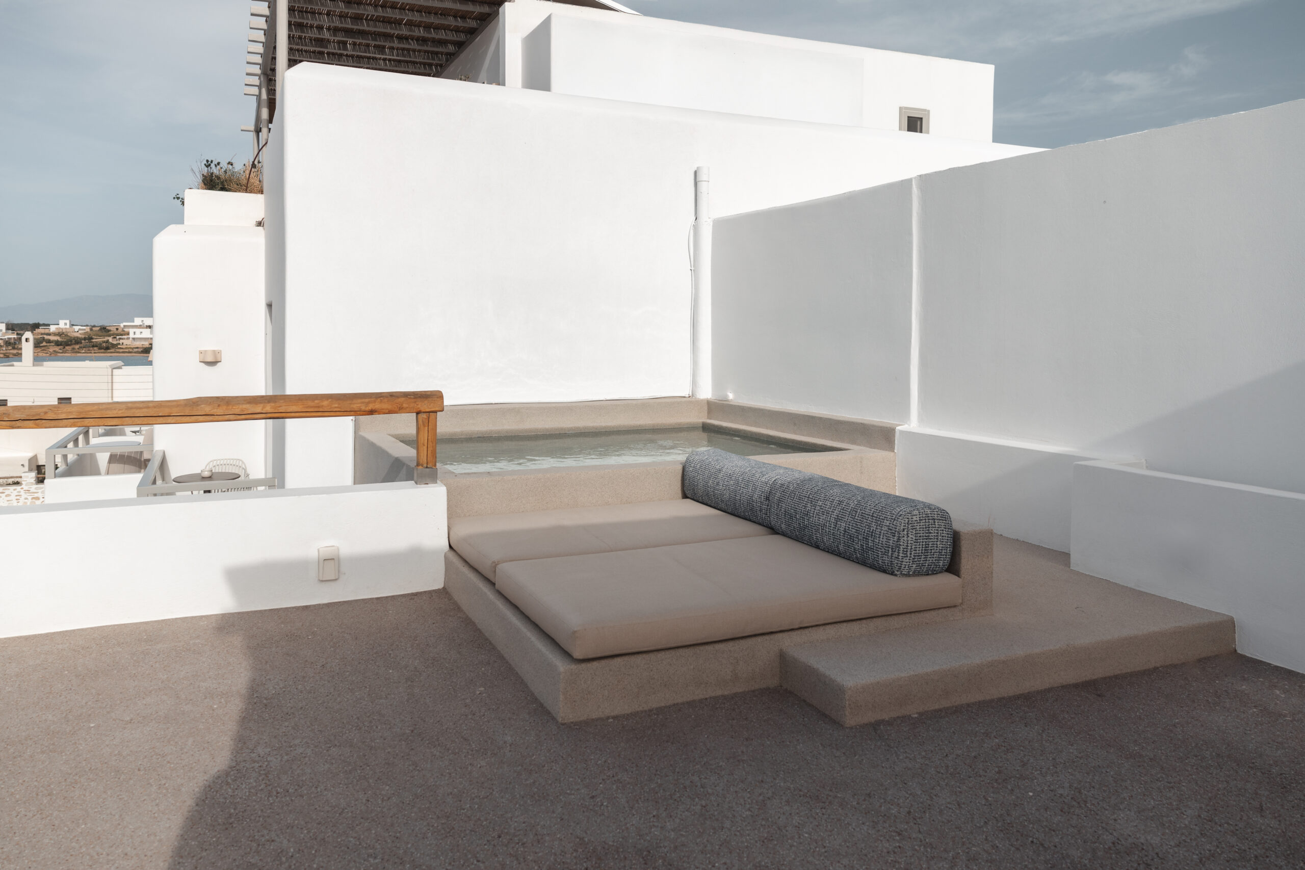 The Private Exterior Step outside to a private Mediterranean oasis. Guests of Malatesta enjoy exclusive access to an expansive patio, featuring a private plunge pool. Whether you are sunbathing on the elegant sunbeds or enjoying an al-fresco dinner with the Aegean Sea as your backdrop, the outdoor space is designed for pure relaxation.