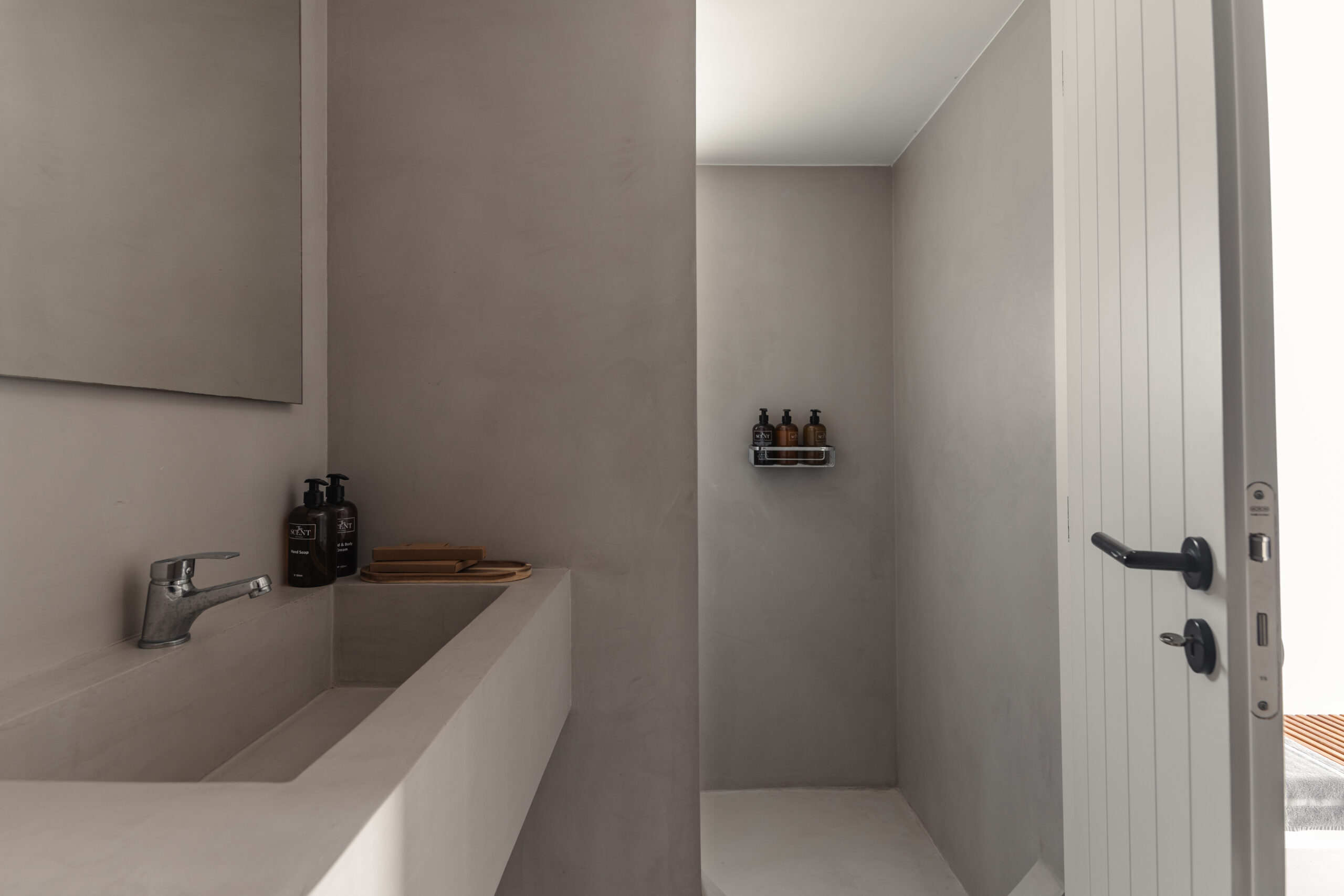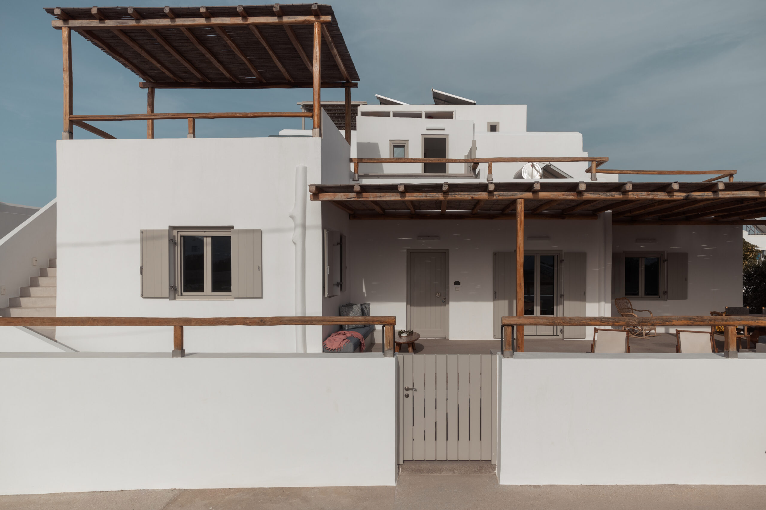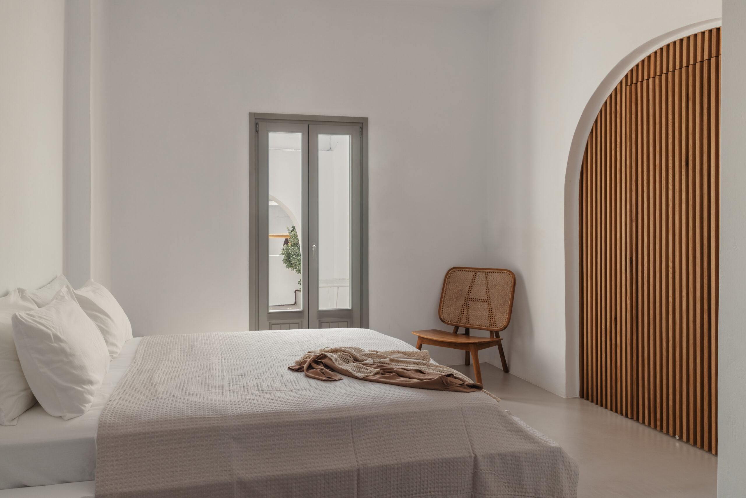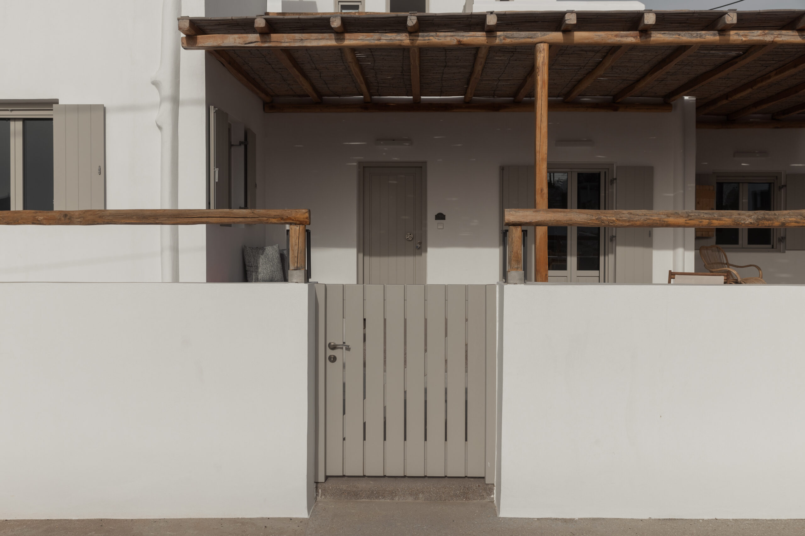 The Private Exterior Step outside to a private Mediterranean oasis. Guests of Malatesta enjoy exclusive access to an expansive patio, featuring a private plunge pool. Whether you are sunbathing on the elegant sunbeds or enjoying an al-fresco dinner with the Aegean Sea as your backdrop, the outdoor space is designed for pure relaxation.